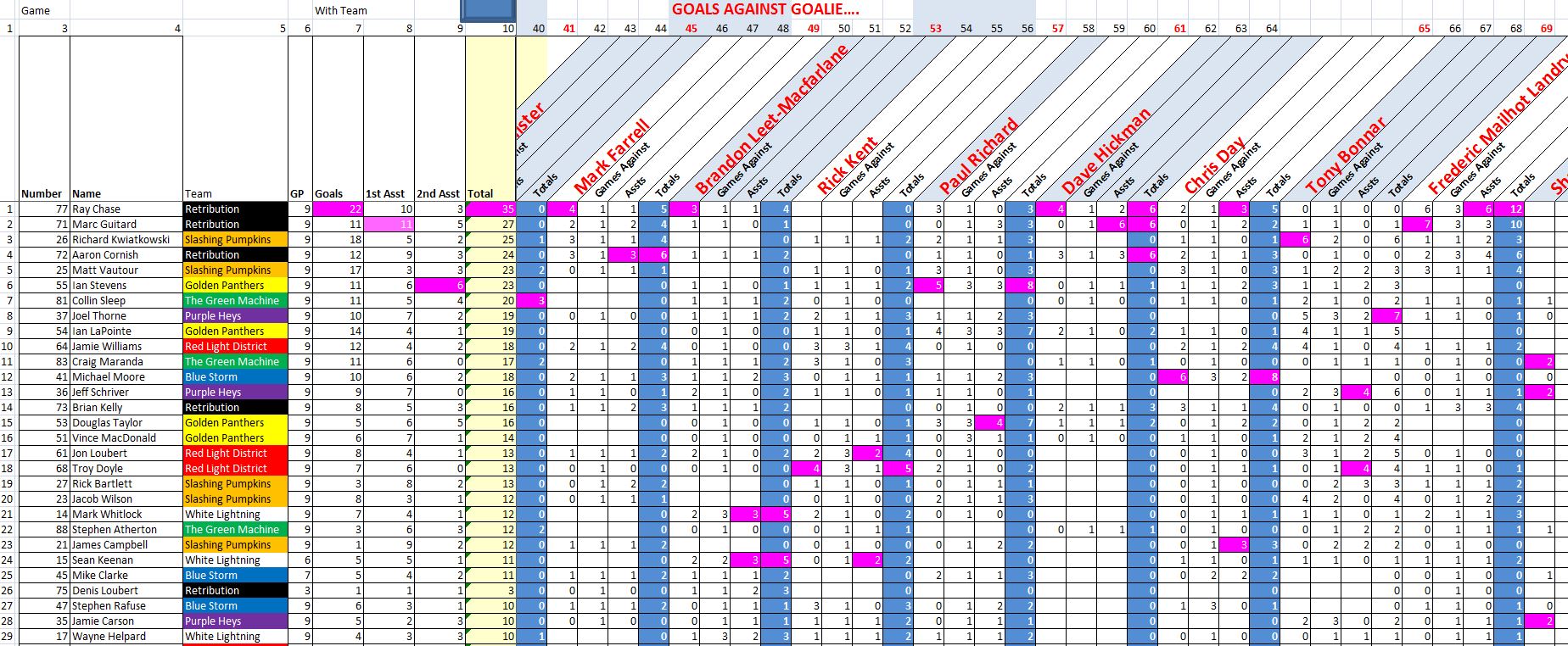 Stats are compiled through Week #3. Pink boxes highlight the “power chords” in a given category (i.e. Who scored the most goals on Goalie X, who had the most points, etc).