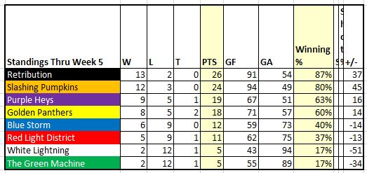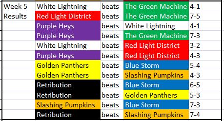Congratulations to White Lightning for their coming out party. Two big wins for a team that everyone knew was about to break out of a rough stretch. Retribution climbed back into first with a 3-0 run. “Heys” also make a 3-0 run for the first time in the young season.