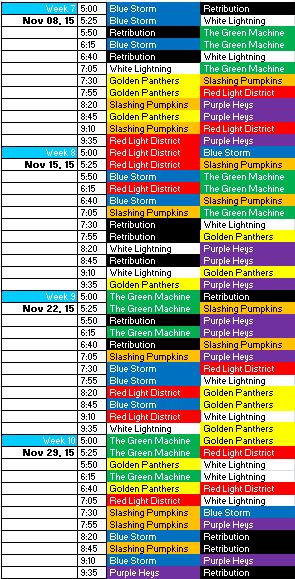 Please note: Games scheduled for Nov 8, 15, and 22nd remain unchanged. Games that had originally been scheduled for Nov 1st have simply been moved to Nov 29th.
