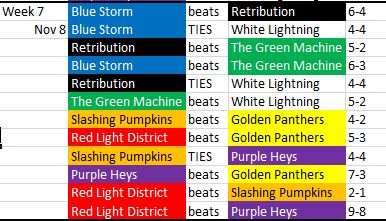 The Skeleton Crew of the Red Light District hammered out three wins in Week 7. Blue Storm serve notice going 2-0-1, while the White Lightning continue to flash brilliance in tying both Retribution and Blue Storm.