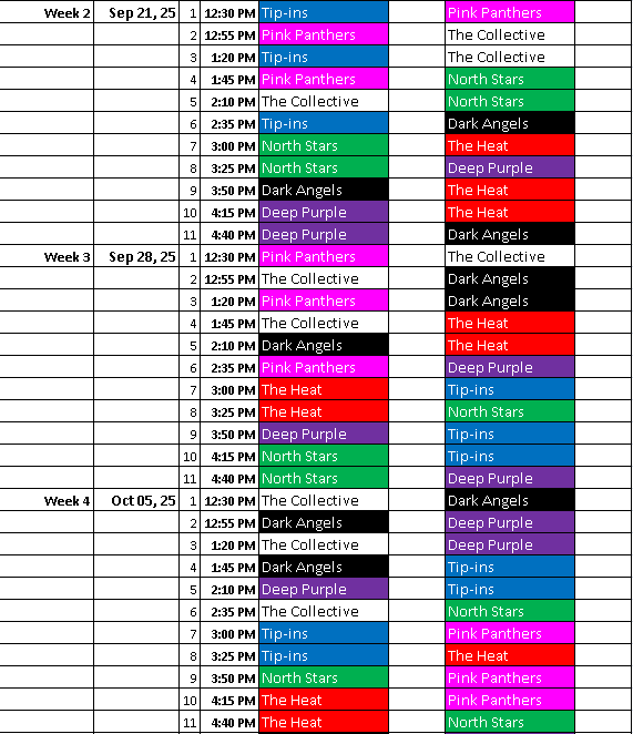 For the next few weeks games begin at 12:30 PM instead of 1:00 PM. This means all games begin 30 minutes earlier than previously posted. Below is an updated schedule: