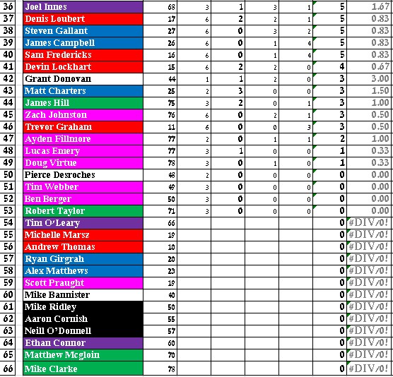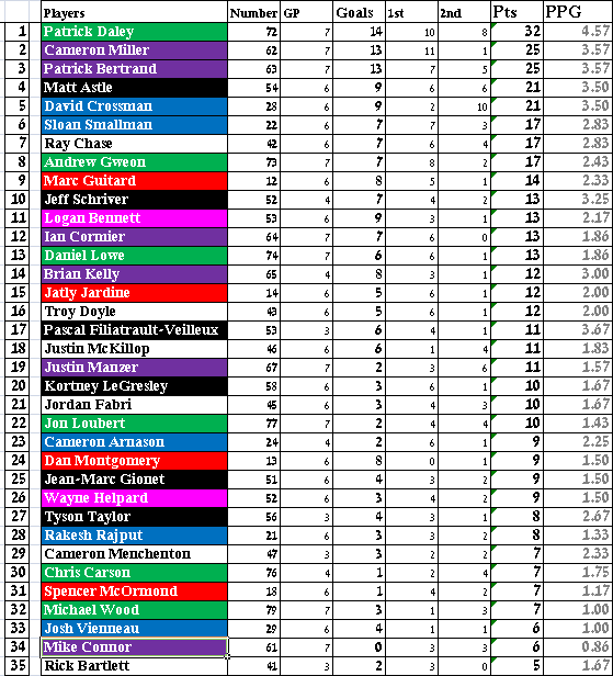 Still some tweaks to take care of with goalie stats and scoring by spares. Below are the results through games of Week 2 (Sept 21).