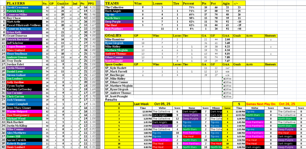 Below are the results from Week 4 (Oct 5). PLEASE NOTE NEXT GAMES PLAYED WILL BE OCTOBER 26 due to Thanksgiving and the gym being occupied for a tournament the following week.
