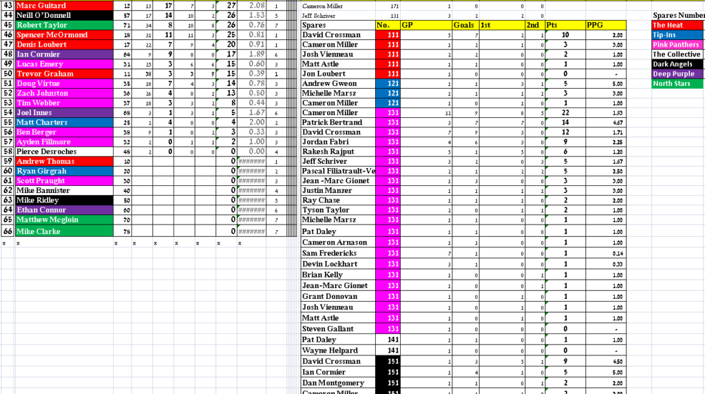 Huge Week for Dark Angels on the back of Mike Ridley allowing a miserly 3 goals over the entire Week 14 campaign, including a shutout. Kudos also to Pink Panthers notching two wins on the week.