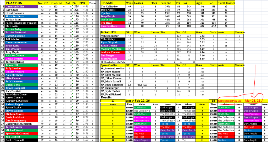 Please note that there are NO GAMES on March 1st. Play resumes March 8th